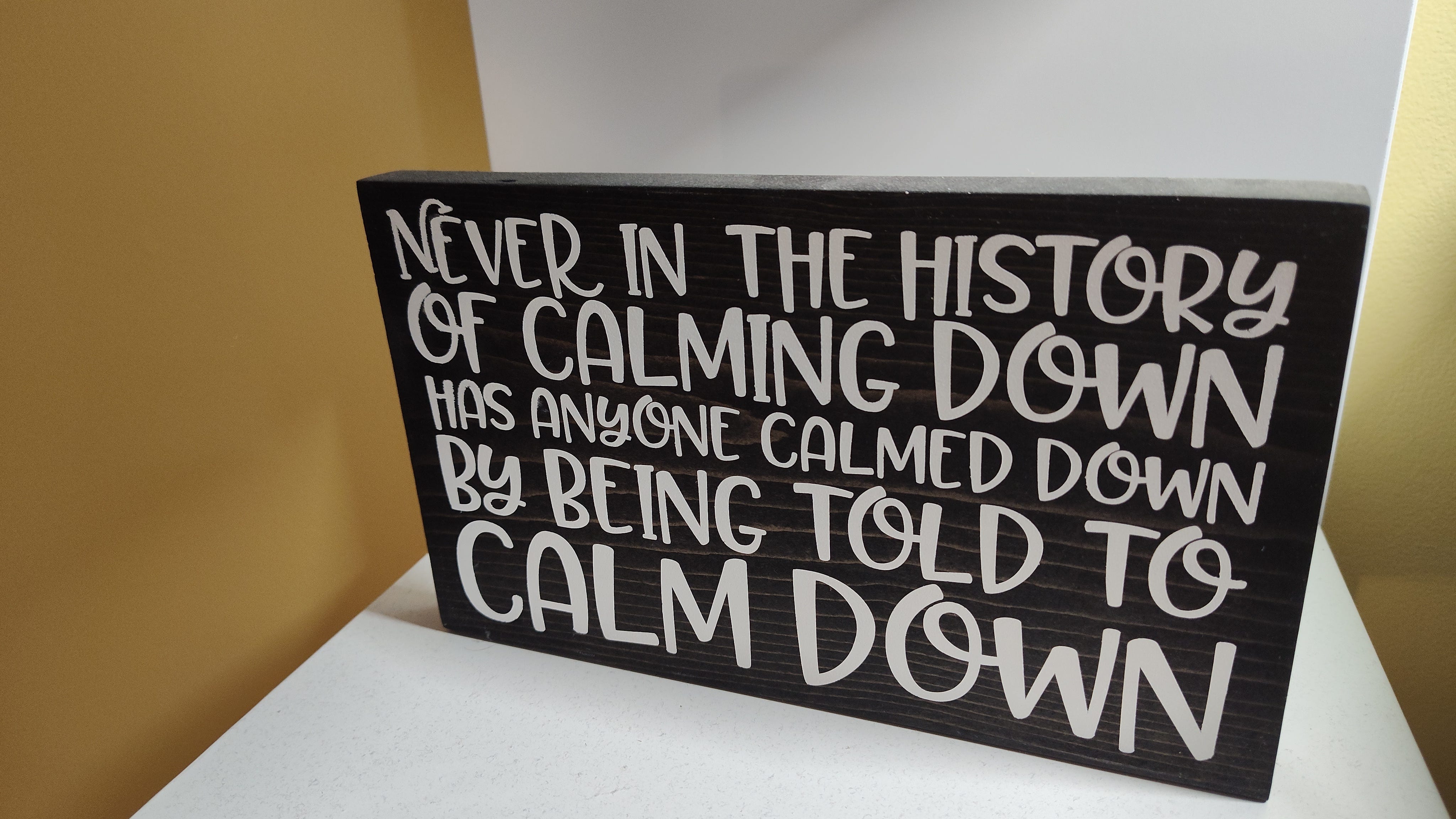 These Release & Refresh classes are unique in that they do not invite you to “calm down” — I personally have big issues around being asked to “calm down” and honestly find it disrespectful to what’s ACTUALLY happening in one’s nervous system. (Because whatever is happening is worth paying attention to; it holds key information for us about our fight/flight or freeze patterns. If we force ourselves to “calm down” then we’ll miss out on all that information.) I found this sign many years ago in a store and immediately purchased it: